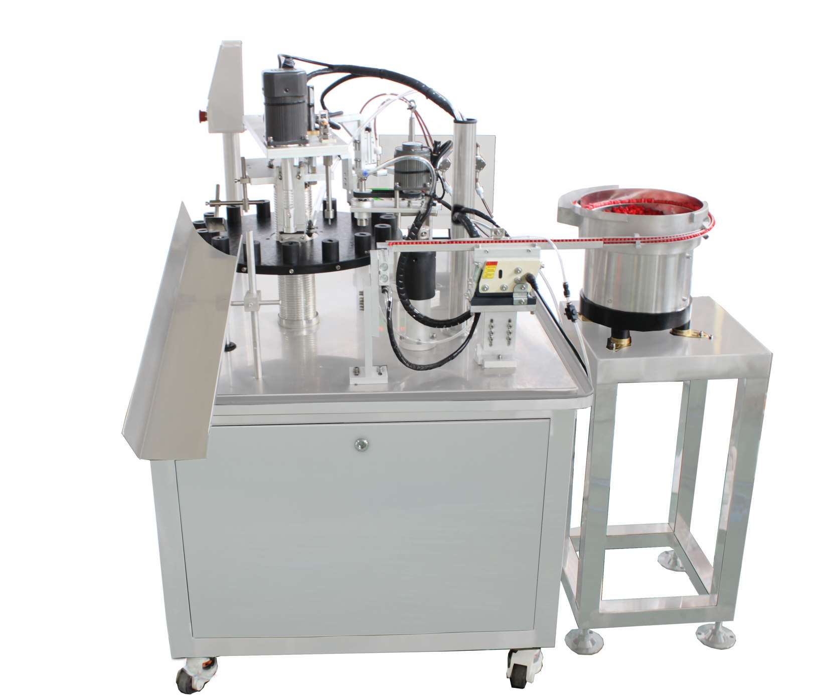 自動(dòng)灌裝軋蓋機(jī)一體機(jī)可用于西林瓶、精油瓶、香水瓶全自動(dòng)灌裝旋蓋及鎖蓋設(shè)備。整套流程分為:理瓶-灌裝-壓塞-掛蓋-軋蓋,其特點(diǎn)為生產(chǎn)穩(wěn)定,對(duì)包材通用性強(qiáng)。